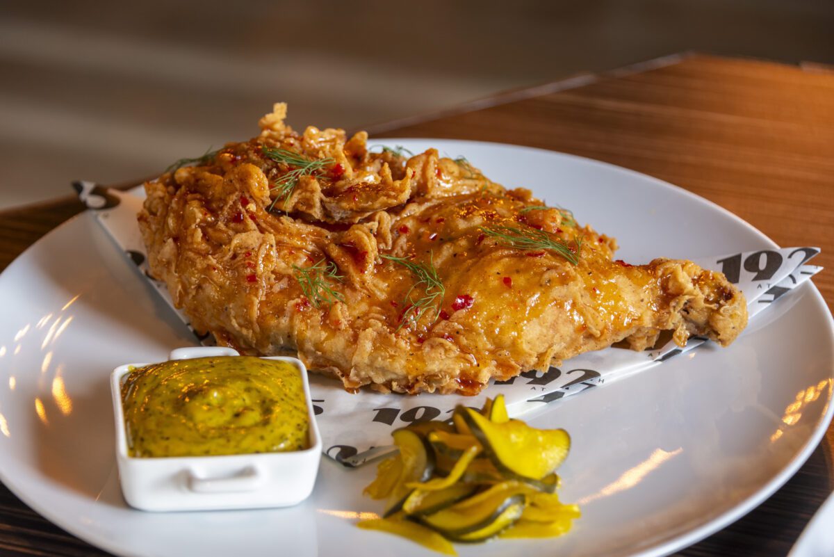 That halibut comes in a rich, silky smooth classic French beurre blanc with salmon roe on top. Other dishes were being prepared while that fish was still in the ocean. There’s a decadently rich slice of unctuously smooth pork belly that takes three days to cure and slowly cook. It’s served with honey dijon glaze, a piquant peach chow chow, and a tasty corn purée. There’s fried chicken too. It is slowly cooked sous vide for four hours, then lightly fried. It’s spectacular.