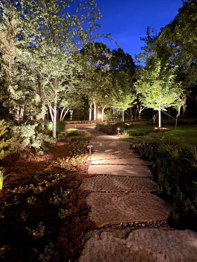 If you are starting from scratch, “mature landscape materials give that instant gratification, instead of waiting five to ten years for a tree to get to the desired height,” says Caviness. “Landscape lighting incorporated into the design gives a homeowner a dramatic view at night, not to mention addressing safety issues.”