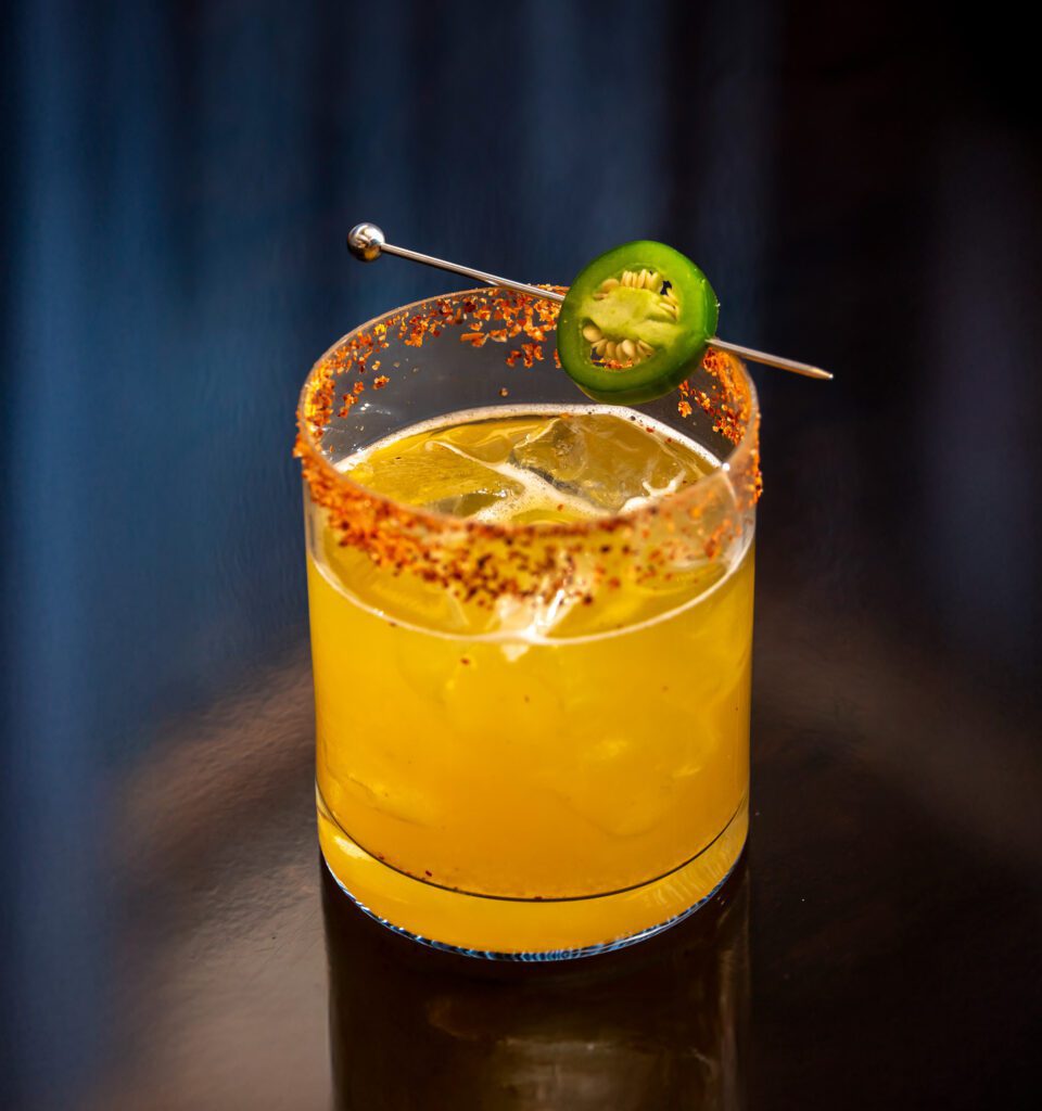 Blanco tequila, Ancho Reyes, Cointreau, lime, agave syrup, ancho pepper liqueur, Tajín rim