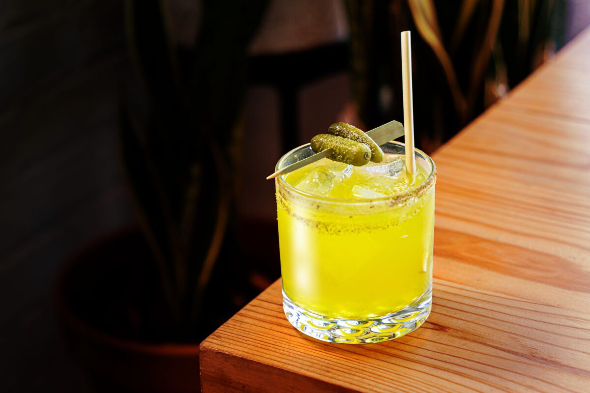 Pickle vodka, lime, mint, cucumber bitters, celery salt rim