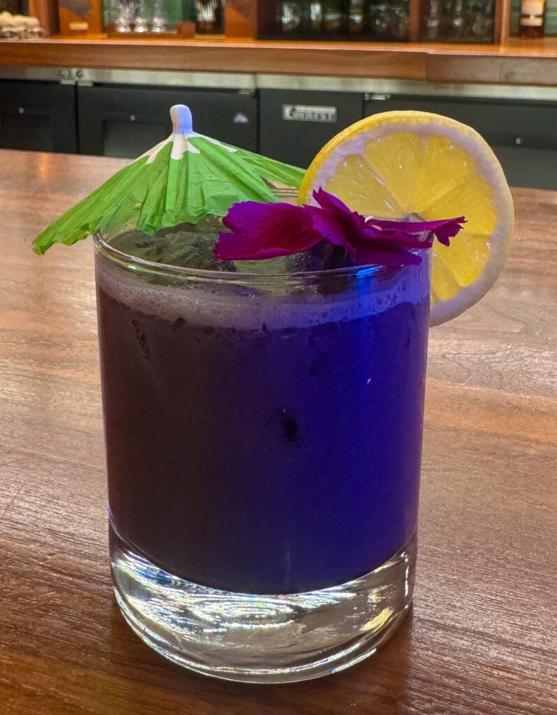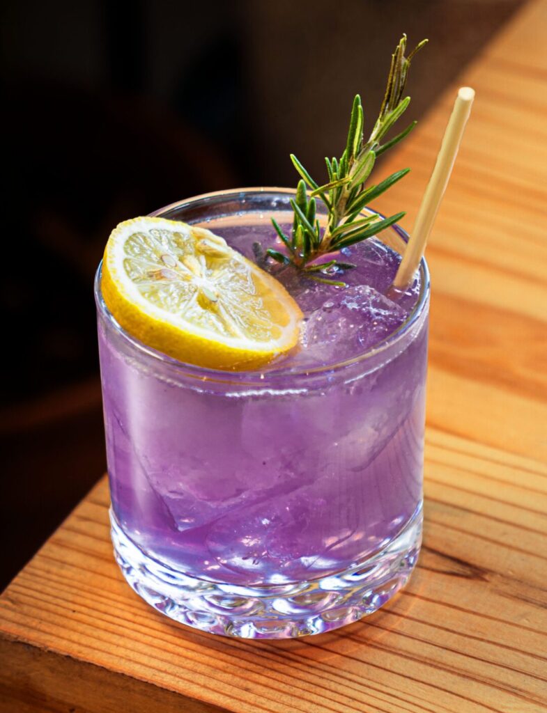 Butterfly pea flower infused gin, lemon, elderflower, rosemary, jasmine green tea