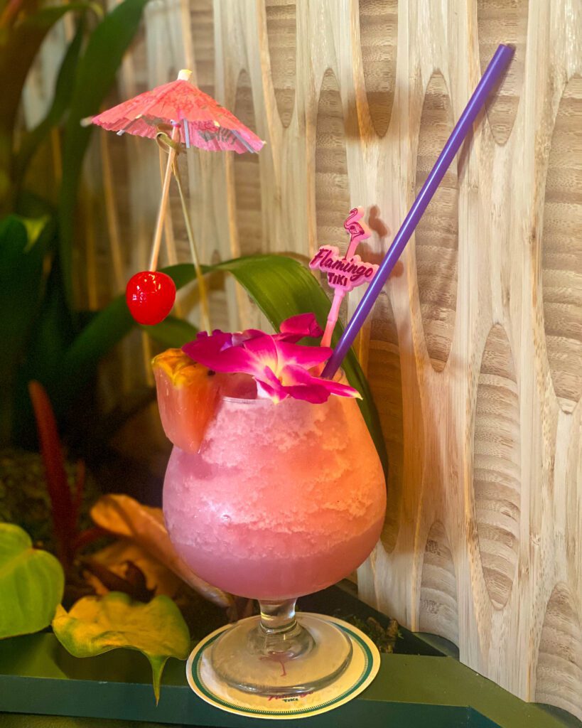 Light rum, Rhum Agricole, dark Jamaican rum, coconut cream, lime, hibiscus, pink pineapple, orgeat, falernum