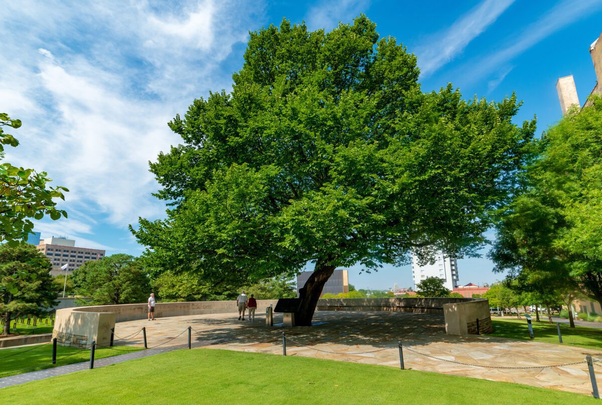 At the highest point of the Memorial is the Survivor Tree, a century-old elm that survived severe blast damage, fire and flying debris.
