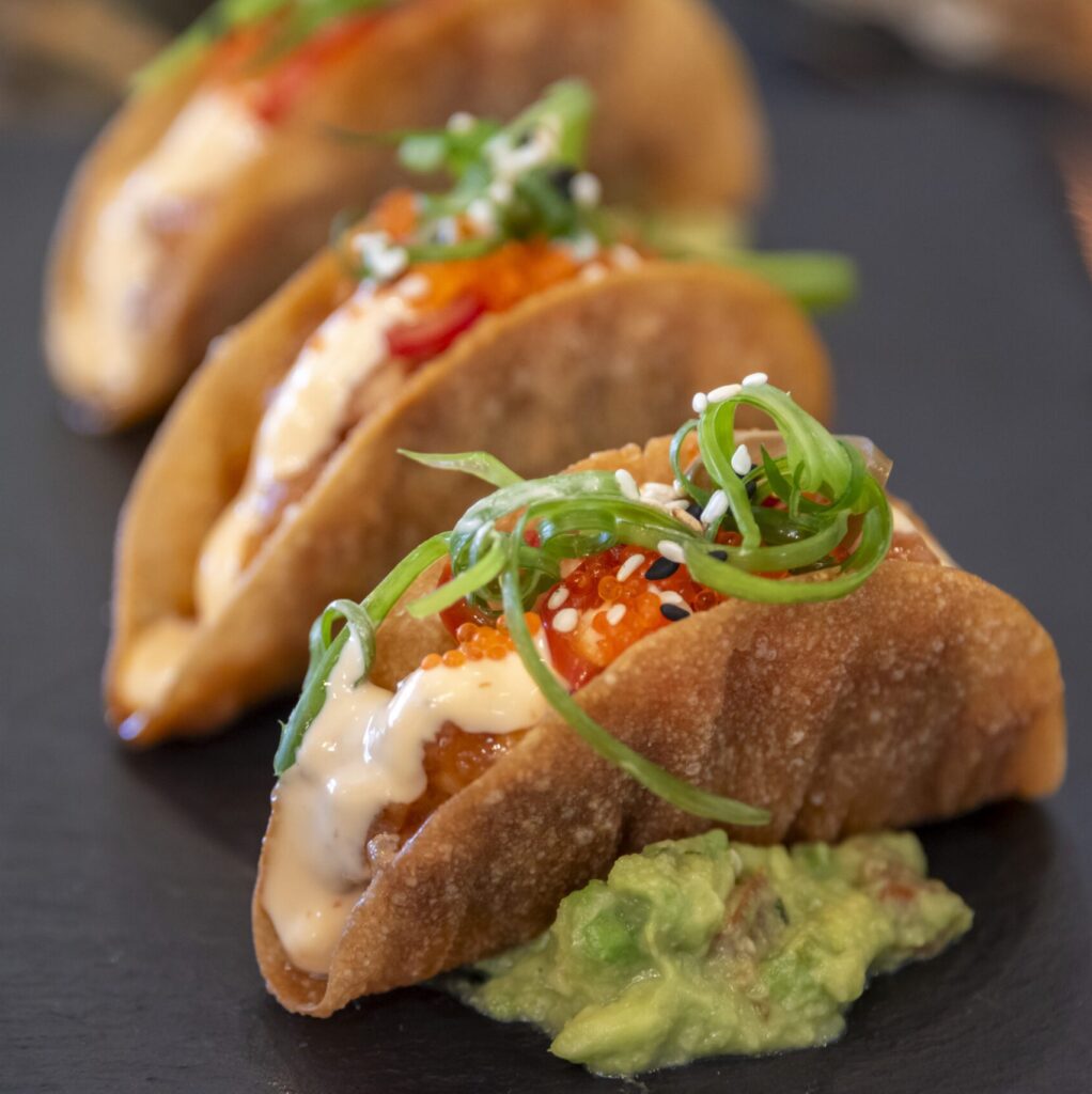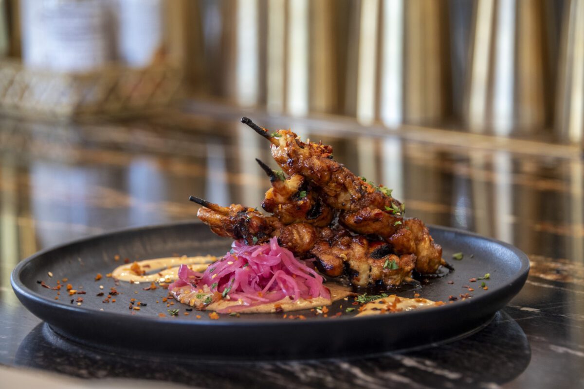 Start with the chicken satay. It’s marinated for many hours in ginger and garlic. Instead of the traditional Indonesian peanut sauce, they use a sauce made of almond butter and chili peppers. It’s addictive. Or you might prefer the tuna poke tacos, made with avocado, tobiko and scallions.