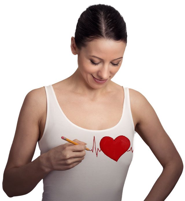 Heart beat. Young woman drawing a heart on her t-shirt