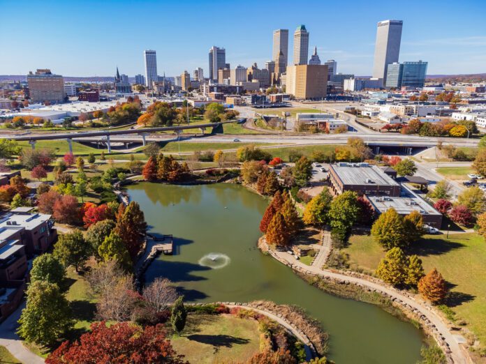 Aerial view of the downtown cityscape and fall color of Veterans Park at Tulsa, Oklahoma